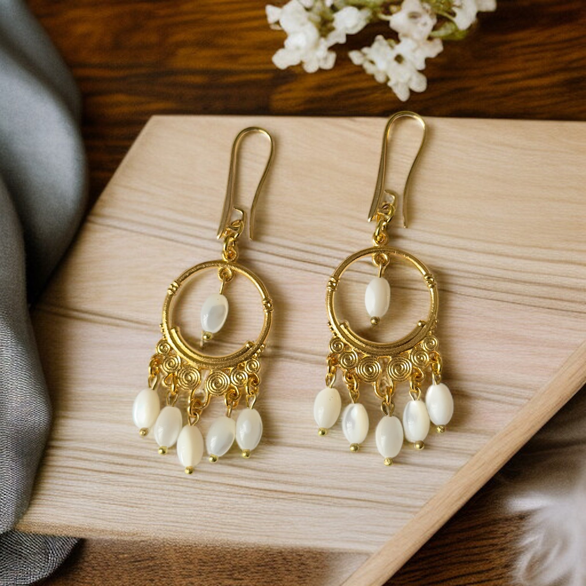 Sedef taşının doğal parlaklığından ilham alınarak tasarlanan bu 18K altın yaldız kaplamalı etnik küpe, hem bohem hem de modern çizgileri zarif bir şekilde bir araya getirir.