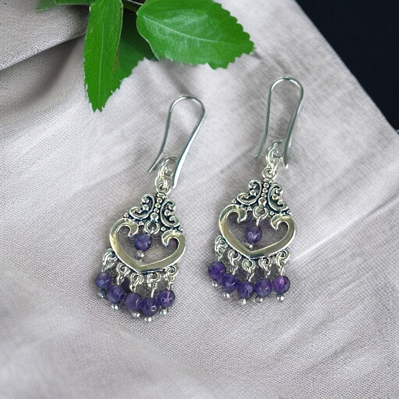Retro etnik desenleriyle dikkat çeken bu küpeler, her kıyafete şıklık katmak için idealdir.- Ametist taşı sayesinde hem estetik hem de enerjik bir görünüm sunar; pozitif enerjiyi yanınızda taşır.- Gümüş kaplama materyali ile uzun süreli kullanım ve parlaklık sağlar.- Mor renk seçeneğiyle göz alıcı bir stil oluştururken, farklı kombinlerle uyum içinde olmanızı sağlar.- Doğal taş kullanımıyla benzersiz ve otantik bir aksesuar deneyimi yaşatır.