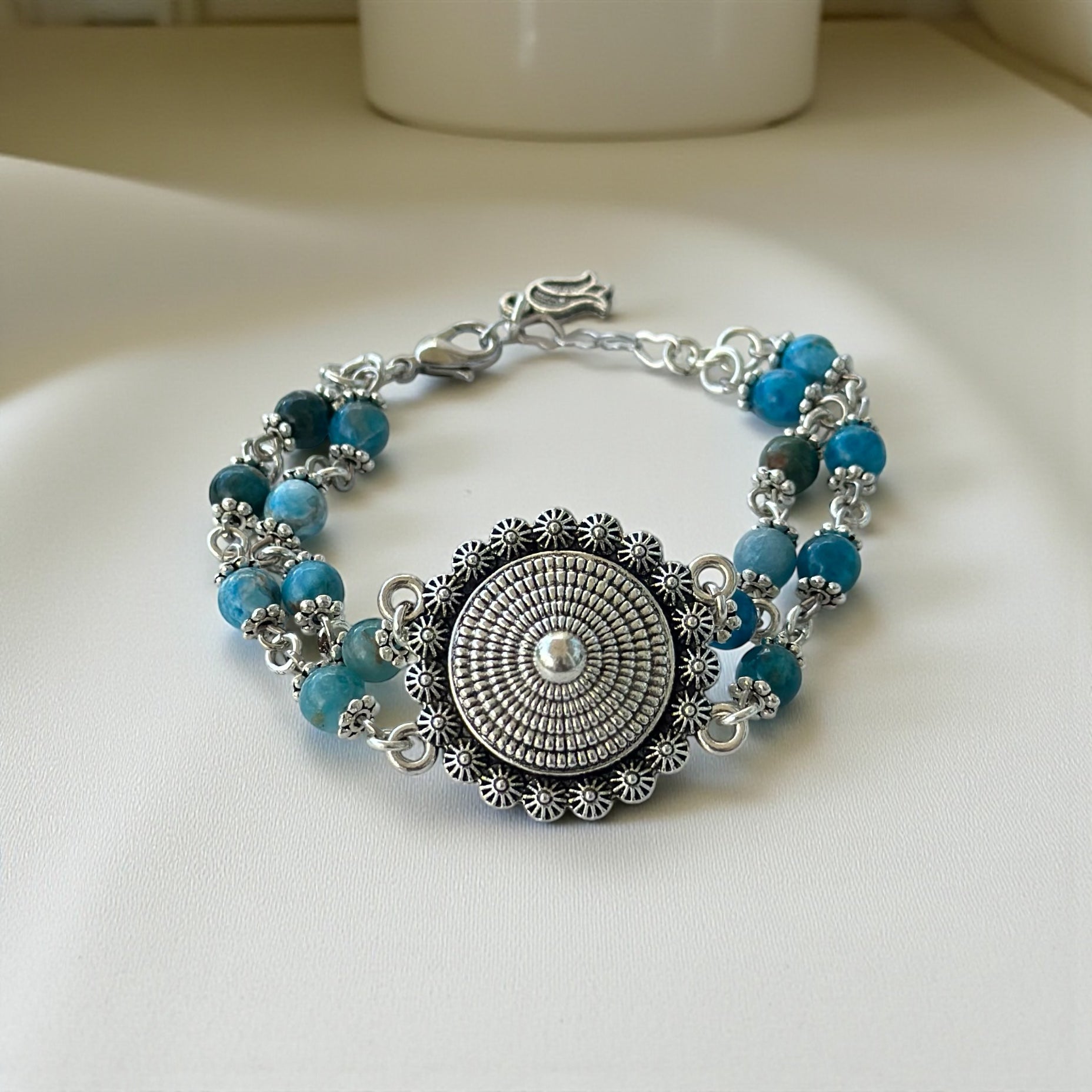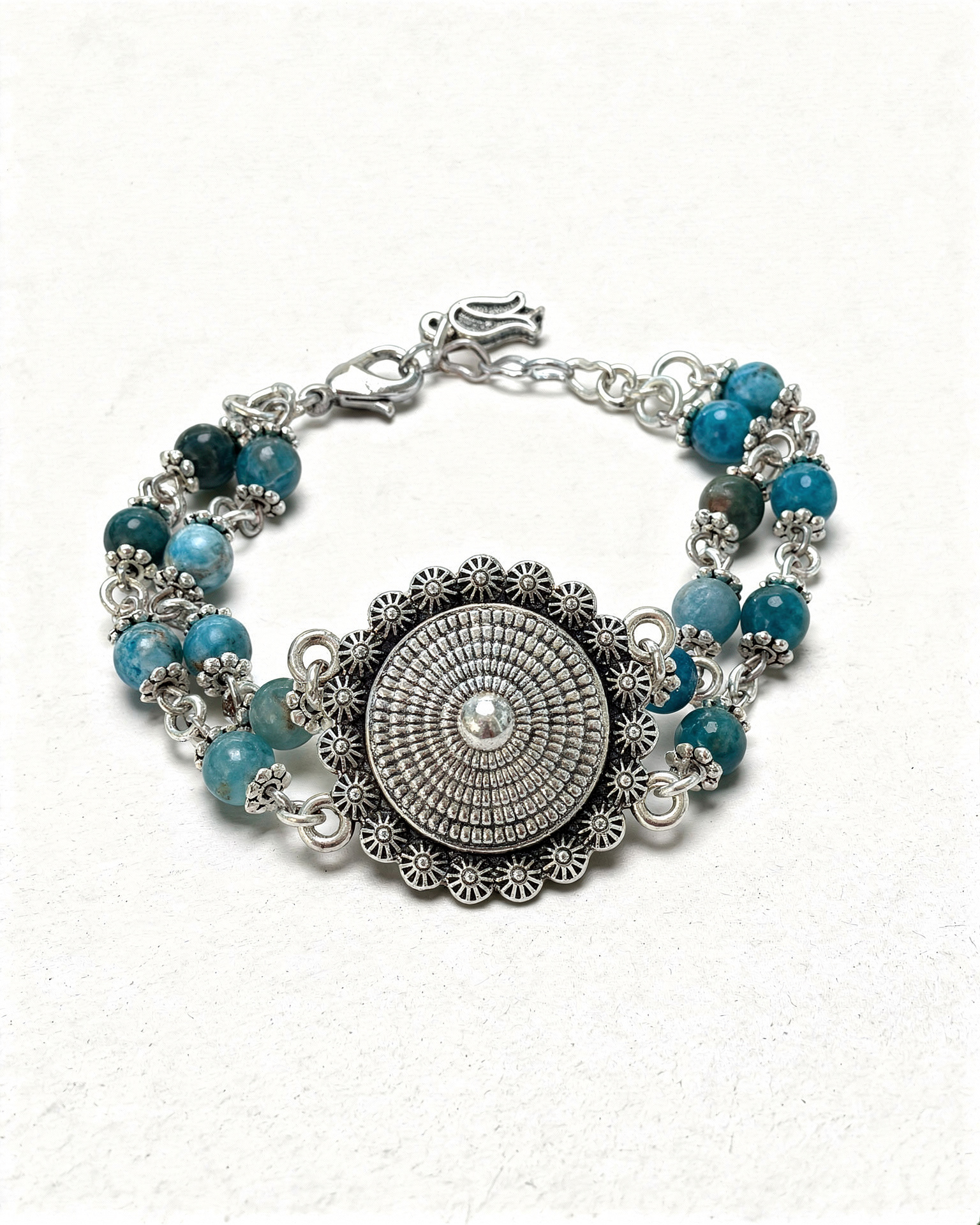 Çift sıra dizilmiş apatit taşları, detaylı çiçek formundaki ara parçalarla birleştirilmiş; merkezde yer alan kabartmalı gümüş rozet motifi, bilekliğe karakteristik bir görünüm kazandırmıştır. Şık, anlamlı ve zamansız bir takıdır.