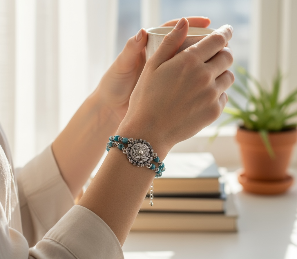Bu bileklik, hem günlük hayatta şık bir tamamlayıcı hem de özel günlerde fark yaratan bir aksesuar olarak kullanılabilir. Retro, bohem ve etnik tarz kombinlerle mükemmel bir uyum sağlar. Hem sade giyimleri renklendirir hem de güçlü bir enerji sembolü taşır.