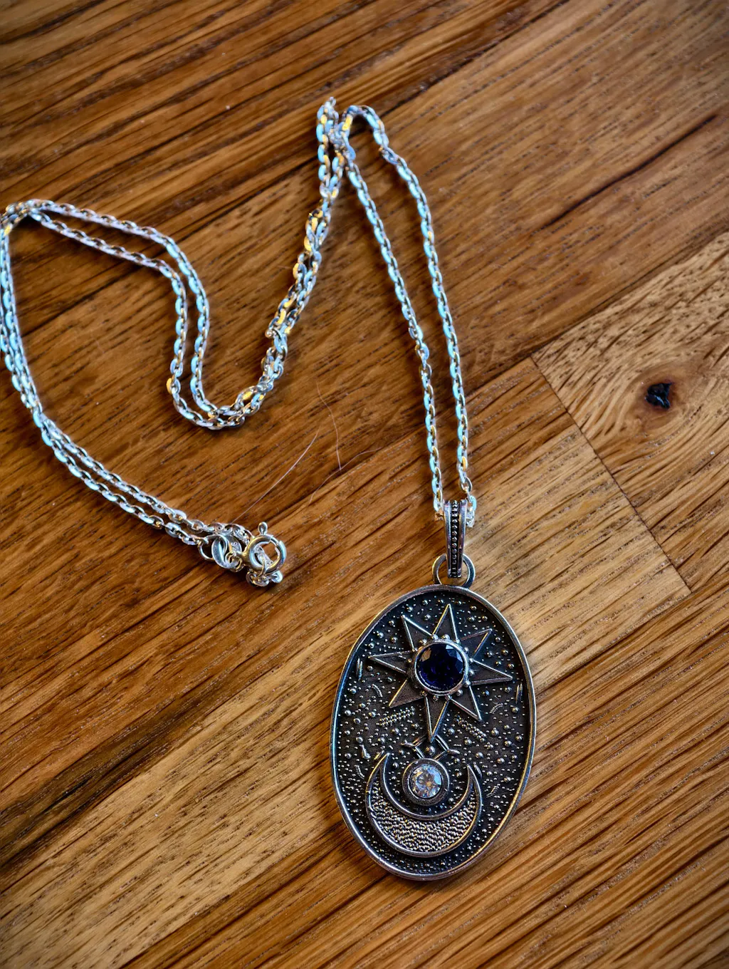 925 ayar gümüş üzerine işlenen güneş, yıldız ve hilal sembolleri; antik uygarlıkların mistik izlerini taşır. Derin mavi zirkon taşlar, gece göğünün sonsuzluğunu simgelerken, ışığı yansıtan detaylar tasarıma büyüleyici bir zarafet katar.